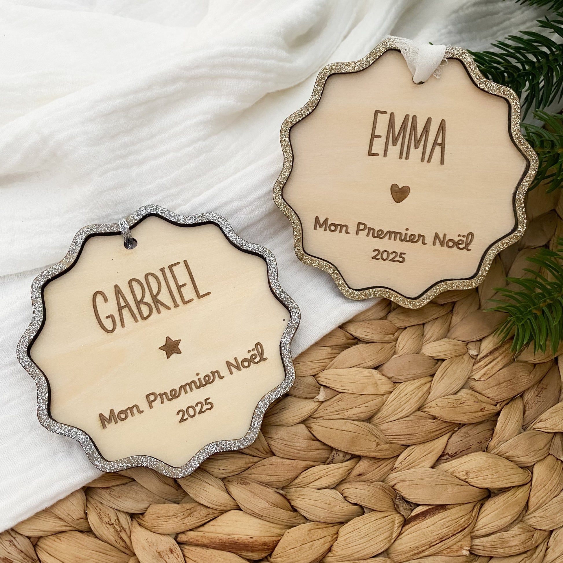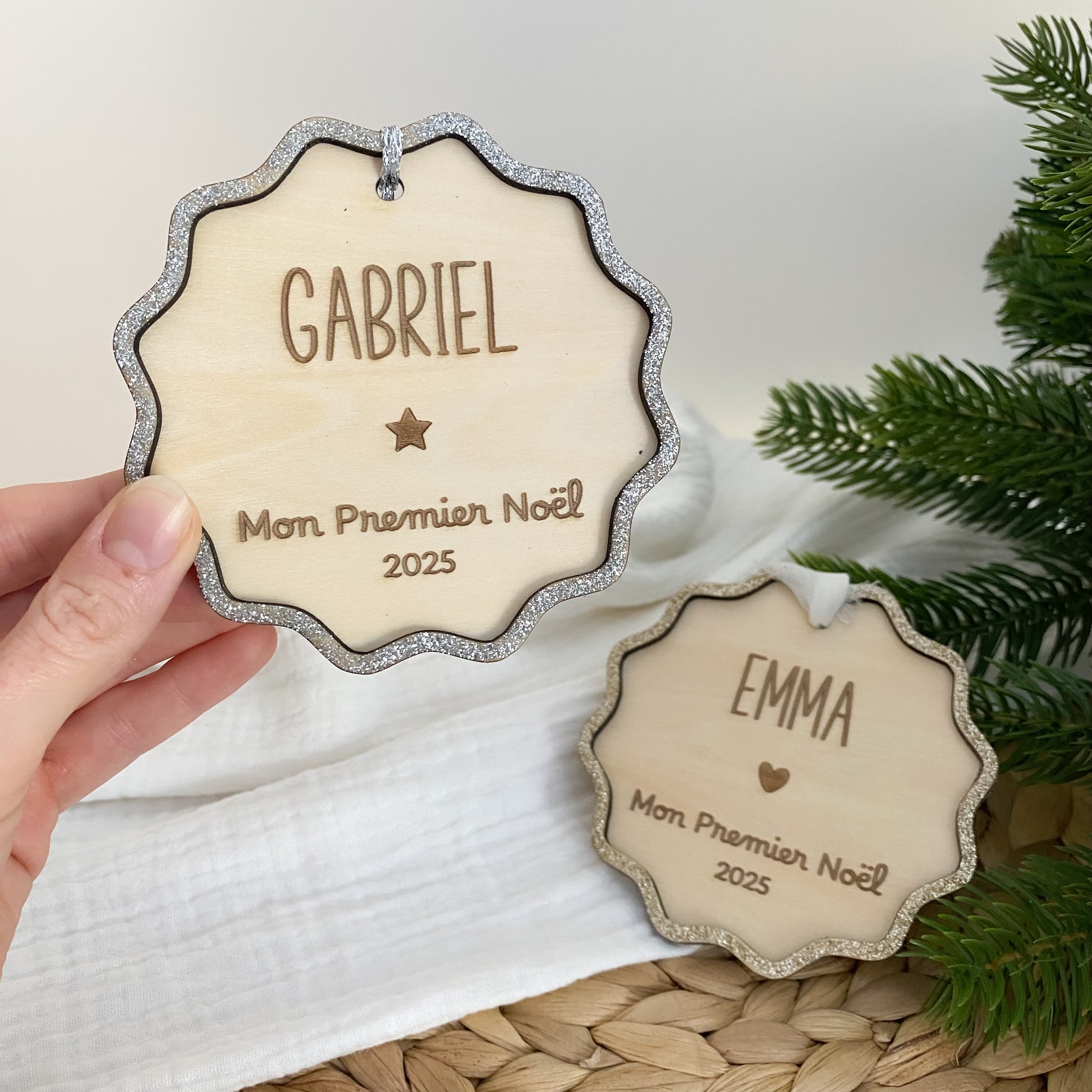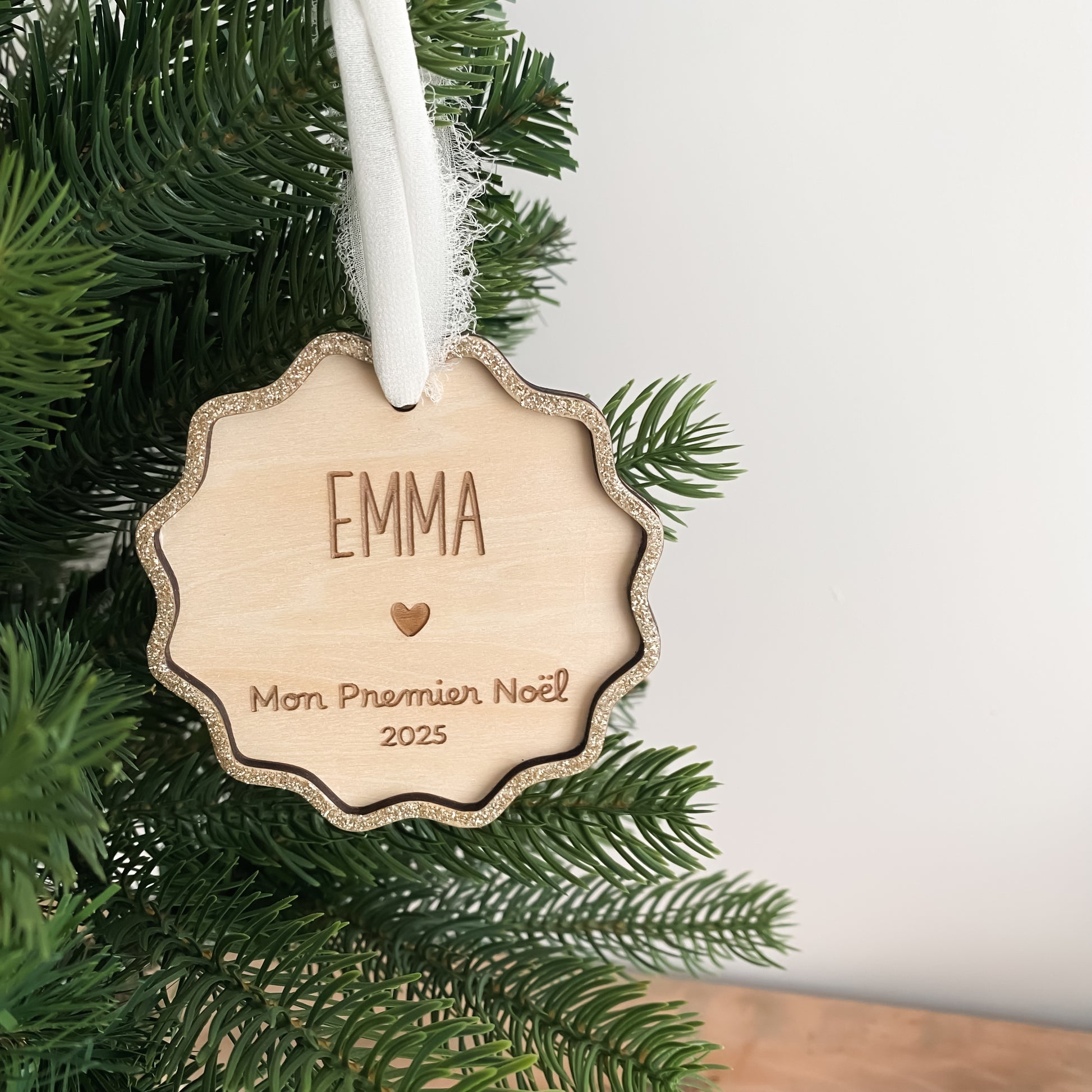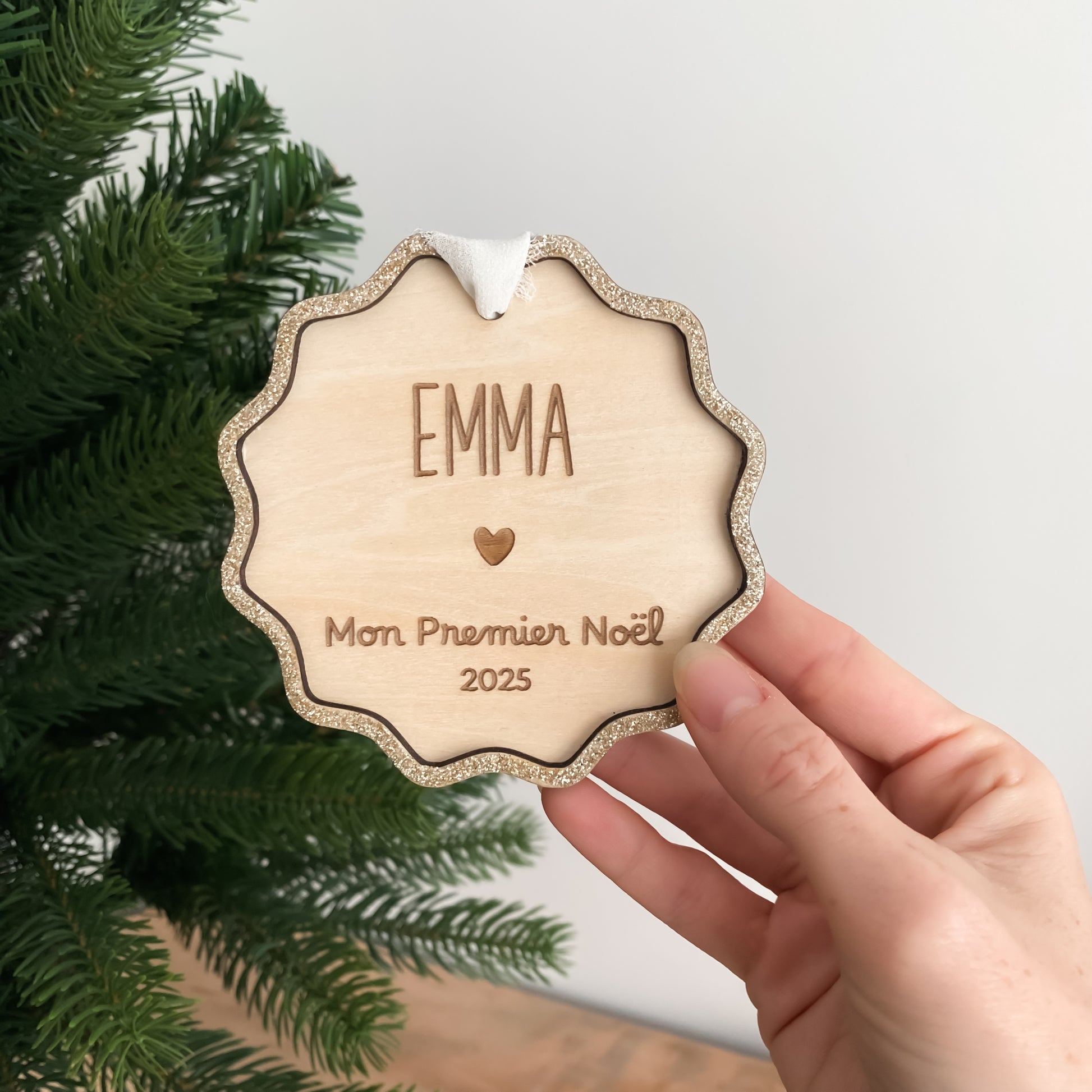 Célébrez le tout premier Noël de votre bébé avec notre boule de Noël en bois et paillettes personnalisée "Mon premier Noël" !