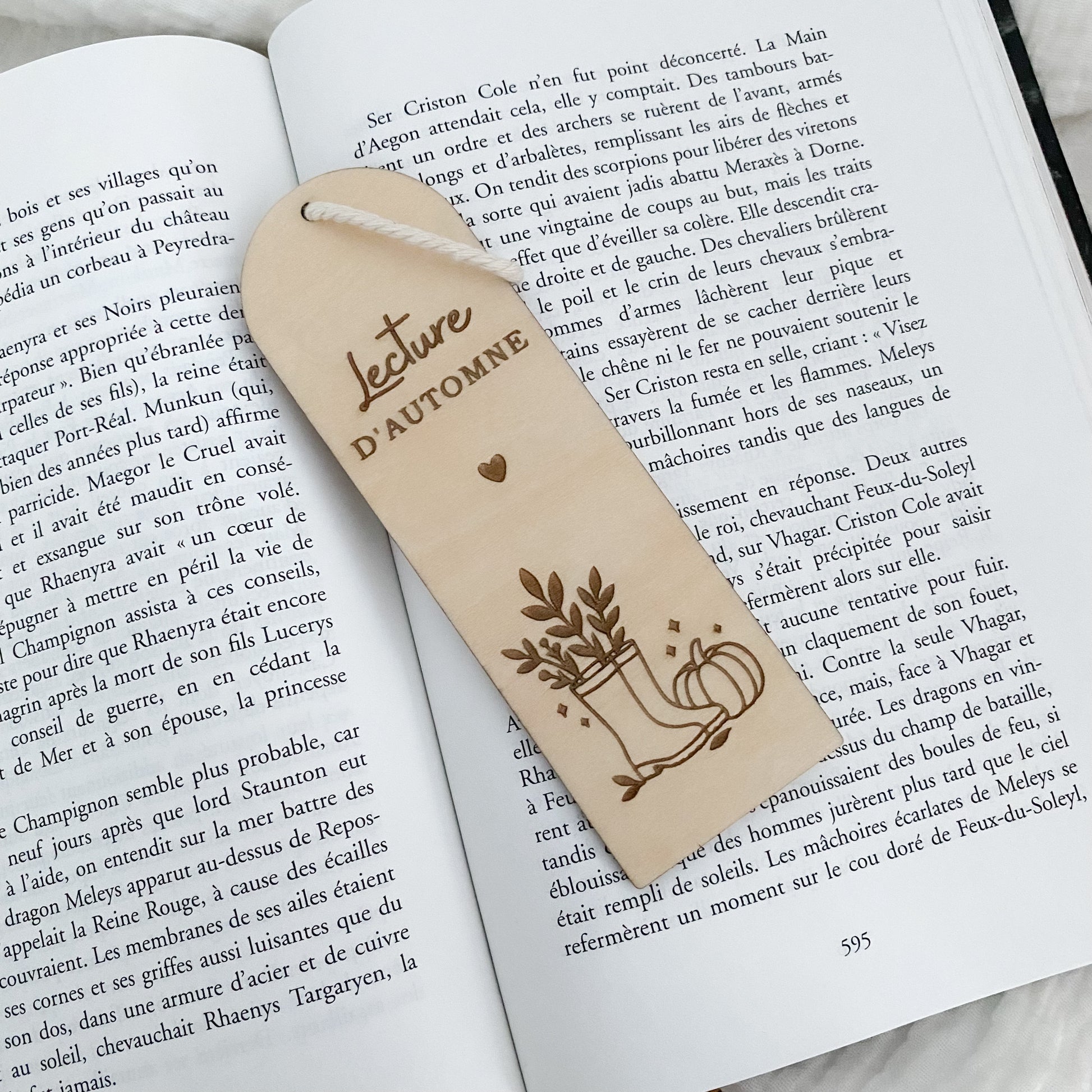Plongez dans l’ambiance chaleureuse de l’automne avec notre marque-page en bois gravé « Lecture d’Automne » !